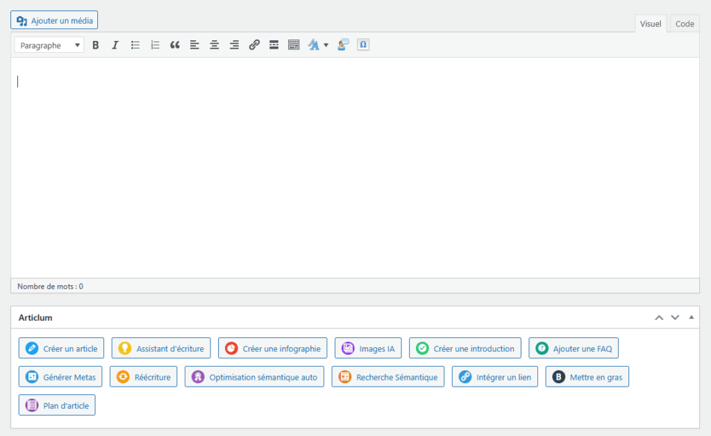 Fini les allers-retours entre plateformes ! Articlum s’intègre parfaitement à votre tableau de bord WordPress pour générer du contenu SEO optimisé en quelques secondes.